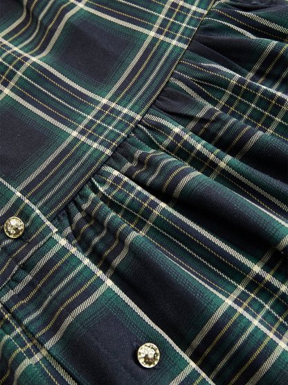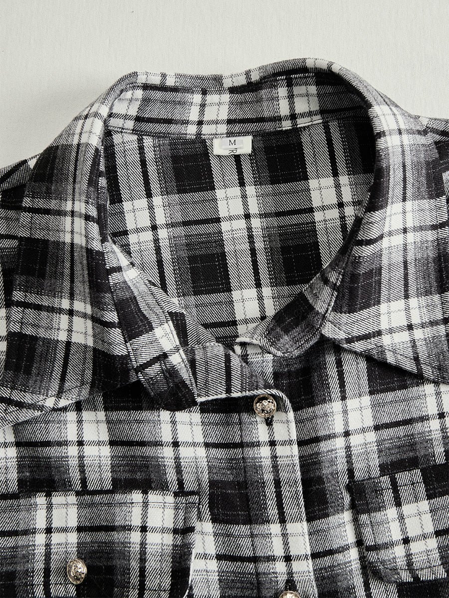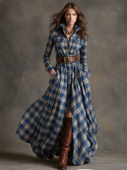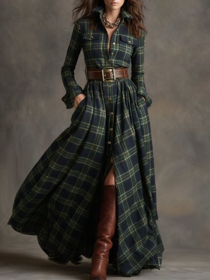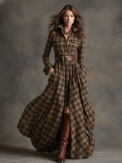 Retro Ethnic Style Lapel Reddish Brown Plaid Maxi Dress