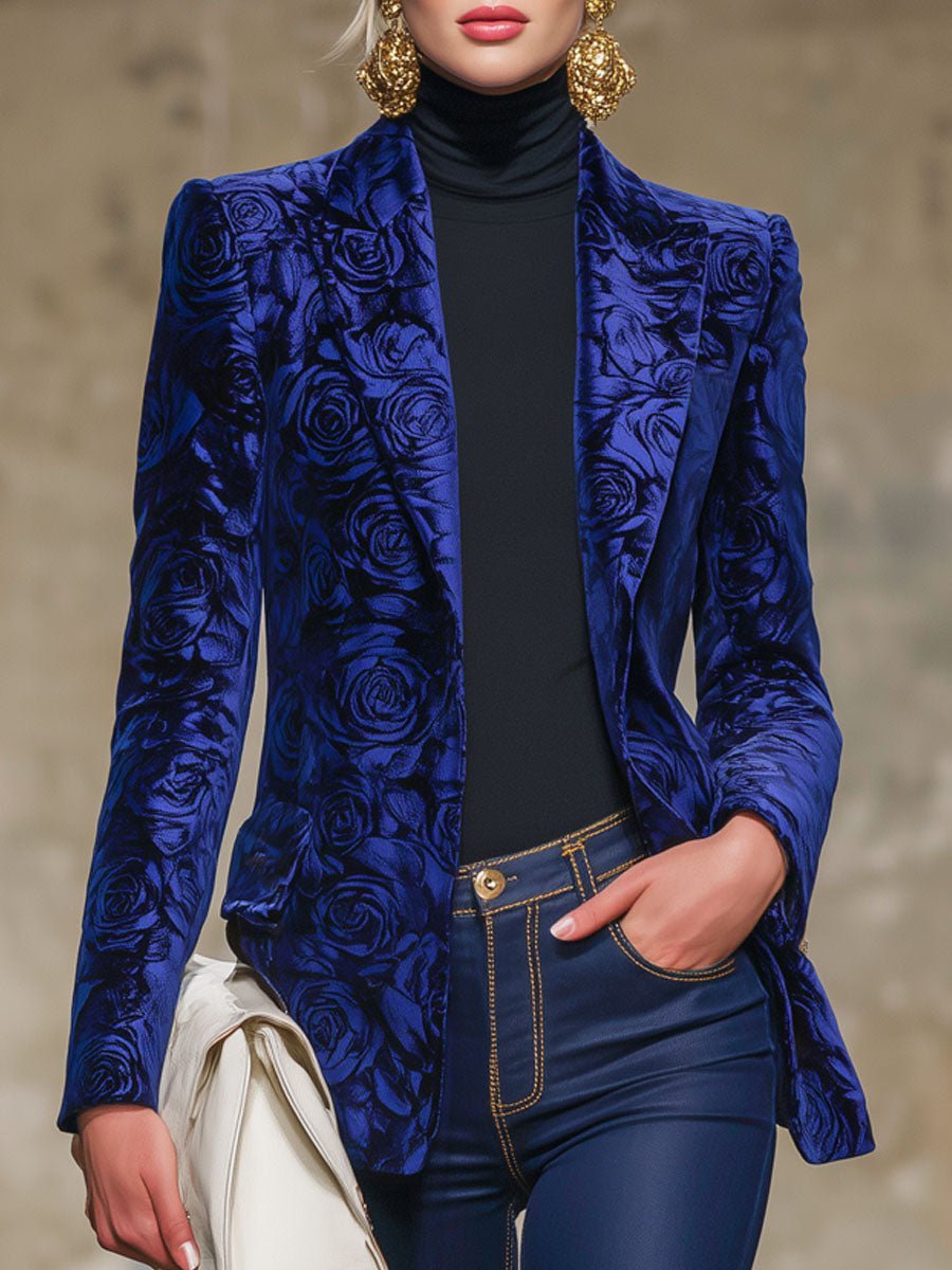 Royal Blue Rose Print Velvet Lapel Blazer
