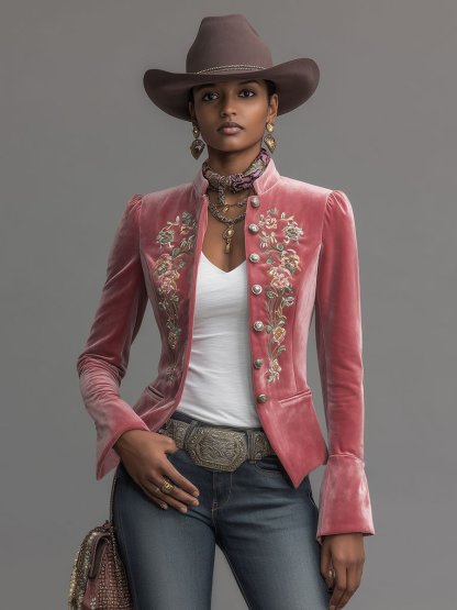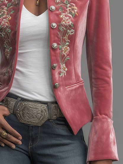 Western-style Stand-up Collar Single-breasted Floral Embroidered Velvet Jacket